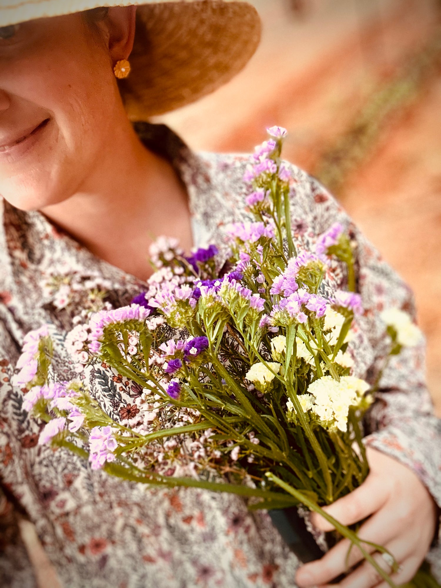 Together with my wonderful husband and our two energetic boys, we've embraced a dream that once seemed as distant as those childhood horizons: our own small-scale flower farm. It's become a true family affair, with all of us finding joy in nurturing our blooms from seed to harvest. There's something magical about watching our children develop their own connection to the land, just as I did growing up in the bush.